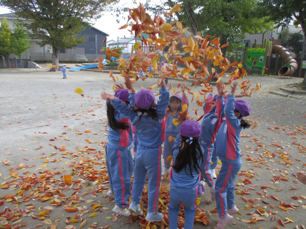 年長組の子どもたちは、きれいな落ち葉をいっぱい集めて「それ~!!」